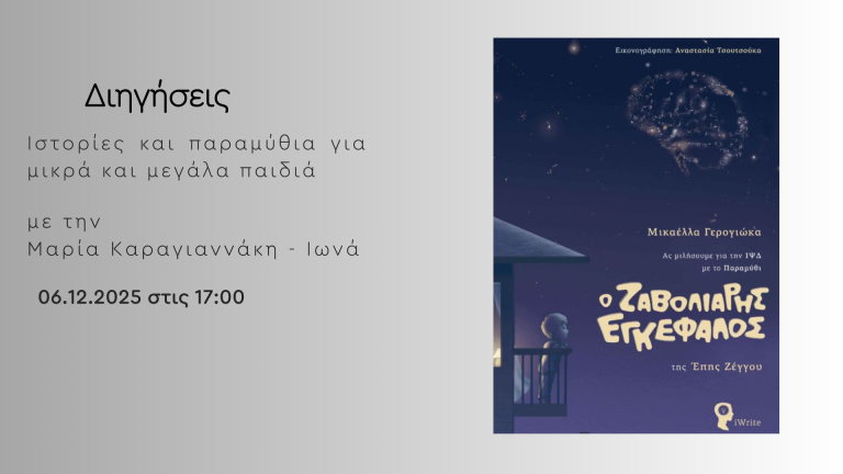 Η εκπομπή «Διηγήσεις» – «Ιστορίες και παραμύθια για μικρά και μεγάλα παιδιά» παρουσιάζει το Σάββατο 06 Δεκεμβρίου 2025 στις 17:00 με 18:00 από τη Φωνή της Ελλάδας το πρώτο μέρος της αφήγησης του βιβλίου «Ο Ζαβολιάρης Εγκέφαλος» των συγγραφέων Μικαέλας Γερογιώκα και Έπης Ζέγγου, μέσα από τη θαυμάσια ιστορία του μικρού Μάνου που διαγιγνώσκεται με ιδεοψυχαναγκαστική διαταραχή (ΙΨΔ).