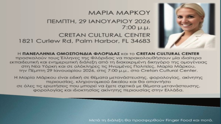 Η Πανελλήνια Ομοσπονδία Φλόριντα σε συνεργασία με το Πολιτιστικό Κέντρο Κρητών, διοργανώνουν στο Παλμ Χάρμπορ μια ενδιαφέρουσα εκδήλωση για μεταναστευτικά, φορολογικά και κληρονομικά ζητήματα, καθώς επίσης και για θέματα απόκτησης ιθαγένειας, με κεντρική ομιλήτρια την διακεκριμένη ομογενή δικηγόρο Μαρία Μάρκου.