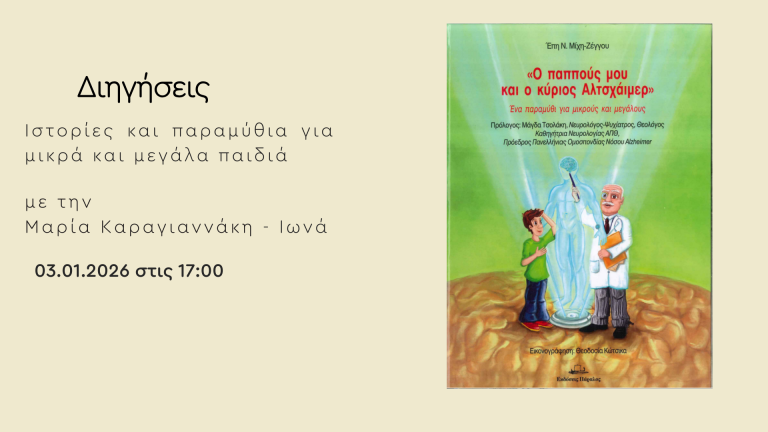 Η εκπομπή «Διηγήσεις» – «Ιστορίες και παραμύθια για μικρά και μεγάλα παιδιά» παρουσιάζει το Σάββατο 03.01.2026 στις 17:00 με 18:00 από τη «Φωνή της Ελλάδας» την αφήγηση του δεύτερου βιβλίου της τριλογίας της Έπης Μίχη Ζέγγου, με τίτλο «Ο παππούς μου και ο κ. Αλτσχάιμερ» από τις εκδόσεις Πάραλος.