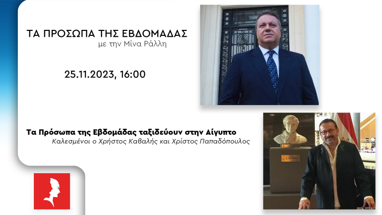 Στην Αίγυπτο μας ταξιδεύει αυτό το Σάββατο 25-11-2023 στις 16.00, η εκπομπή «Τα Πρόσωπα της Εβδομάδας», που παρουσιάζει η Μίνα Ράλλη.