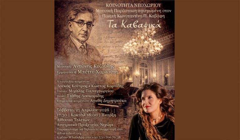 Η Κοινότητα Νεοχωρίου διοργανώνει το Σάββατο 25 Απριλίου 2026, στην Αίθουσα Τελετών του Αυστριακού Προξενείου στο Νιχώρι, τη μουσική και λογοτεχνική παράσταση «Τα Καβαφικά», μια ετήσια εκδήλωση-αφιέρωμα στον μεγάλο Αλεξανδρινό ποιητή Κωνσταντίνο Π. Καβάφη.