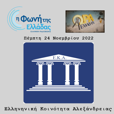 Ο δημοσιογράφος, συγγραφέας και θεατρικός συγγραφέας Γρηγόρης Χαλιακόπουλος άλλαξε ρότα στη ζωή του… για να βοηθήσει την Ελληνική Κοινότητα της Αλεξάνδρειας! Ανέλαβε την εφημερίδα “Ταχυδρόμος” μια από τις πλέον ιστορικές ελληνικές εφημερίδες που κυκλοφορεί από το 1880! Η εκπομπή ΩΡΑ ΕΛΛΑΔΑΣ και ο Νικόλας Αγγελίδης φιλοξενούν τον Γρηγόρη Χαλιακόπουλο που ξετυλίγει όλο το κουβάρι της ιστορίας με αναμνήσεις, όνειρα και ελπίδες για το σήμερα και το αύριο. Ακούστε ΟΛΗ την εκπομπή της Πέμπτης 24 Νοεμβρίου 2022.