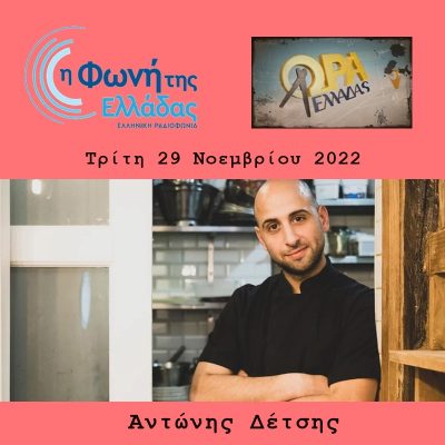 Ο Αντώνης Δέτσης είναι το πιο ζωντανό παράδειγμα λατρείας για την Ελλάδα στο Παρίσι. Αναγνωρισμένος σεφ στη Γαλλική πρωτεύουσα, επιμένει ελληνικά και μαγειρεύει γιουβαρλάκια με οικογενειακή συνταγή, εξιτάροντας τα εγκεφαλικά κύταρρα γεύσης των Γάλλων. Μια ζωή σαν παραμύθι. Από τον Πειραιά, στο Περιστέρι, στη Ζωφριά και από εκεί η οικογένεια του έφτασε στο Παρίσι όπου και γεννήθηκε και μεγάλωσε ο Αντώνης Δέτσης. Λατρεύει με πάθος την Ελλάδα και το κάθε τι ελληνικό. Ο Έλληνας σεφ που έχει εστιατόριο στο 9ο Διαμέρισμα του Παρισιού, δίπλα στο διάσημο Moulin Rouge, μιλάει στον Νικόλα Αγγελίδη και την ΩΡΑ ΕΛΛΑΔΑΣ για τα πάντα… Για τη ζωή του, την οικογένεια του, την Ελλάδα, τη μοναδική τέχνη του. Ακούστε ΟΛΗ την εκπομπή της Τετάρτης 30 Νοεμβρίου 2022.