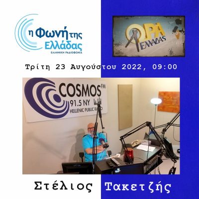 Ο πρόεδρος του Ελληνοαμερικανικού ραδιοφωνικού σταθμού COSMOS FM, Στέλιος Τακετζής βρέθηκε στο Ραδιομέγαρο και την εκπομπή ΩΡΑ ΕΛΛΑΔΑΣ με τον Νικόλα Αγγελίδη. Σε μια πραγματική κατάθεση ψυχής μιλάει για όλους και για όλα… Για την Κωνσταντινούπολη όπου μεγάλωσε, για τη Νέα Σμύρνη στην οποία έζησε σαν παιδί και για τη Νέα Υόρκη που τον κέρδισε μετά τις σπουδές του. Από φτωχή οικογένεια, έκανε πολλές δουλειές, αλλά ερωτεύτηκε τη Ναυτιλία. Σπούδασε Ναυτιλιακά και από το 1979 δημιουργεί στη Νέα Υόρκη… με πάθος για την Ελλάδα και οτιδήποτε ελληνικό! “Η Ελλάδα είναι το αντίσκηνο που στήνω για να προστατεύομαι από τη βροχή”… λεέι χαρακτηριστικά