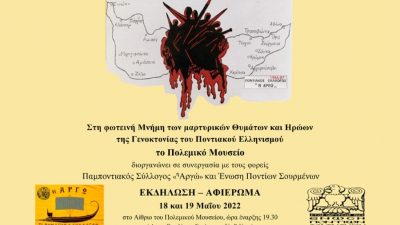 Η εκδήλωση, η οποία πλαισιώνεται με κειμενο-φωτογραφική έκθεση Ιστορίας του Ποντιακού Ελληνισμού θα φιλοξενηθεί στο Αίθριο του Πολεμικού Μουσείου.