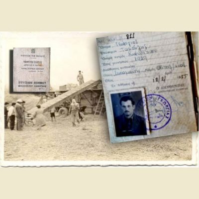 (φωτο: η αλωνιστική μηχανή και το επίσημο χαρτί εργασίας του Γιώργου Τασούλη, ο ίδιος σε ηλικία 19 ετών)